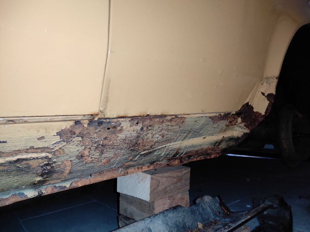 It looks like the valence was intended to protect the sill from moisture and stones being flicked up from the road, but in the long-term this is obviously a perfect place for water to collect and initiate corrosion. Also there’s evidence of Agnetha hitting something like a low wall and having quite a rough repair done which has borne the brunt of the corrosion. The good news is that behind the sill the internal structure seems relatively tidy albeit a little bent out of shape in places.