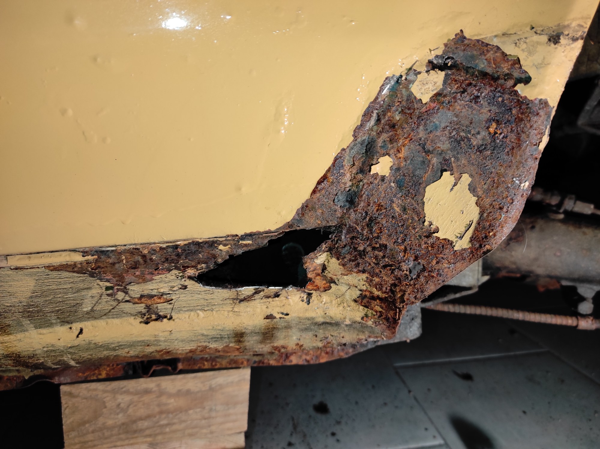 It looks like the valence was intended to protect the sill from moisture and stones being flicked up from the road, but in the long-term this is obviously a perfect place for water to collect and initiate corrosion. Also there’s evidence of Agnetha hitting something like a low wall and having quite a rough repair done which has borne the brunt of the corrosion. The good news is that behind the sill the internal structure seems relatively tidy albeit a little bent out of shape in places.