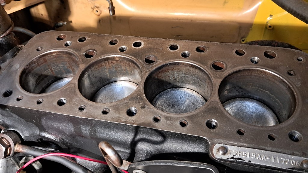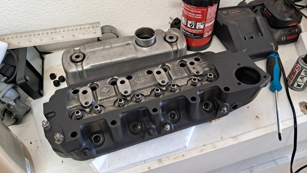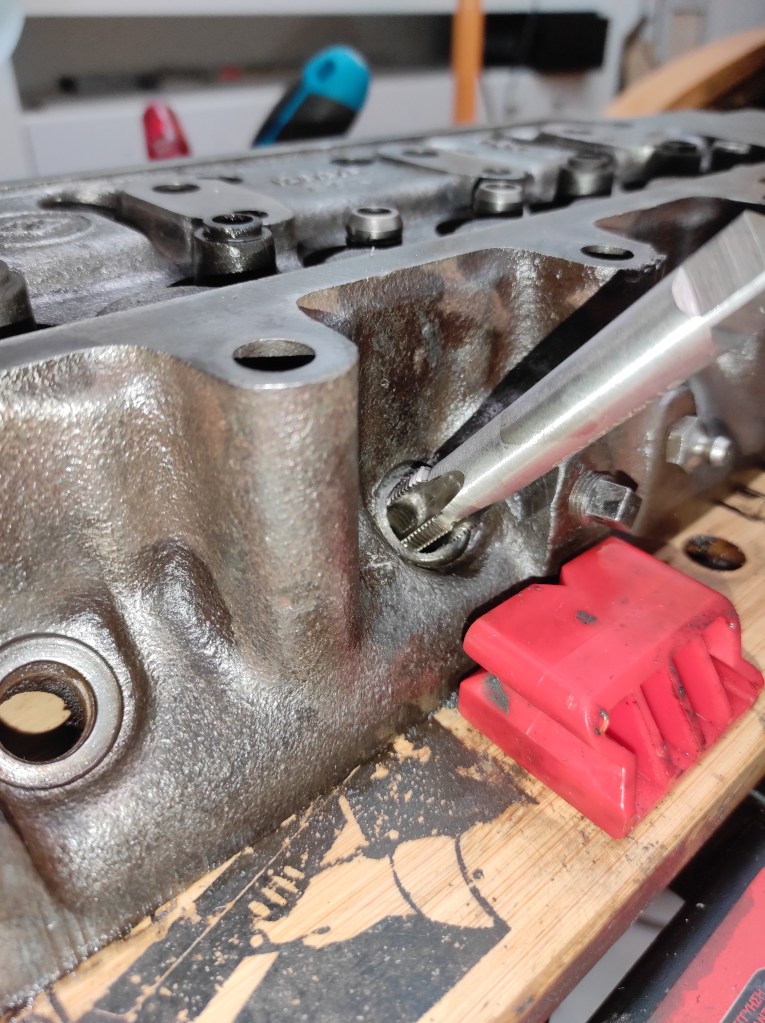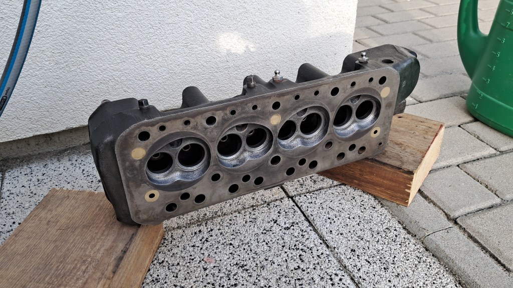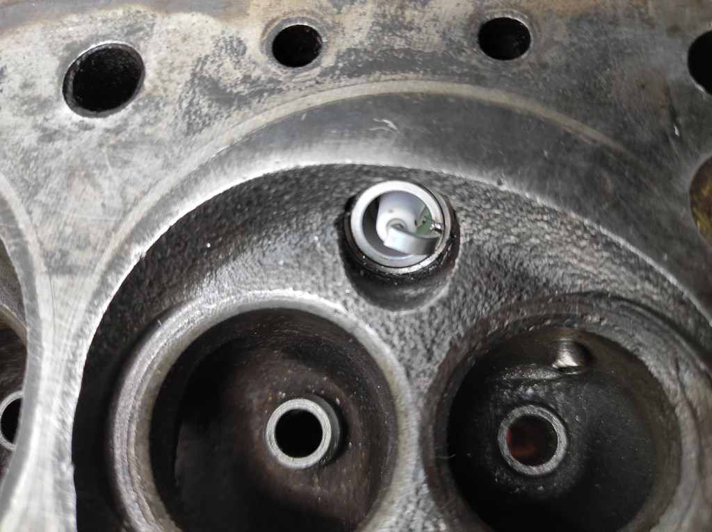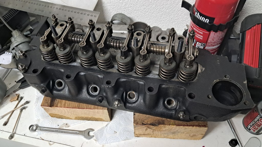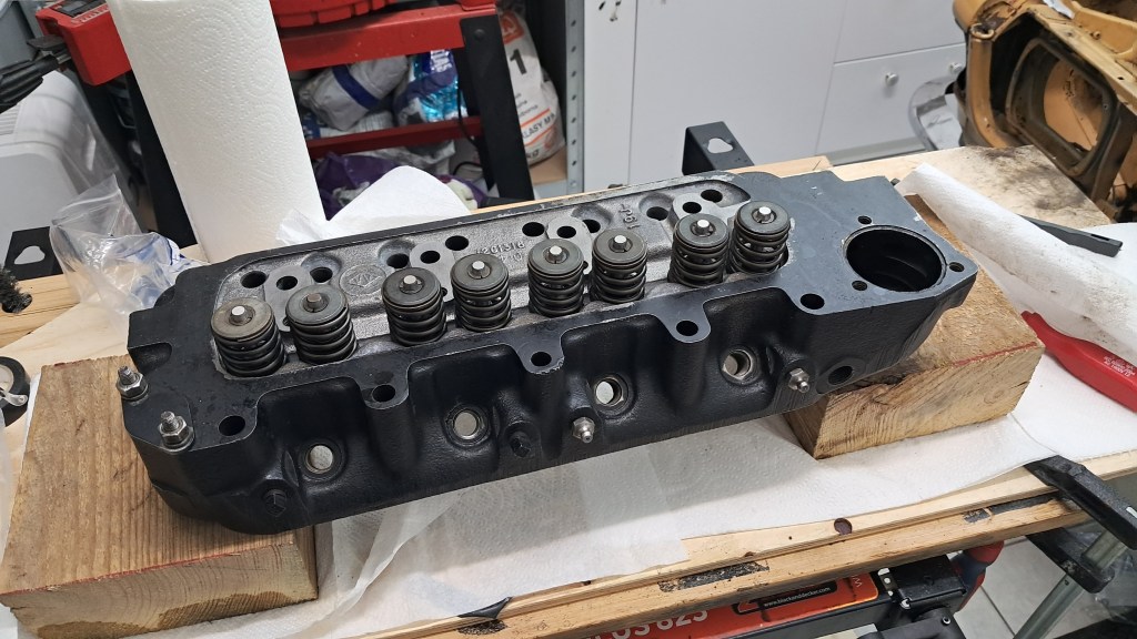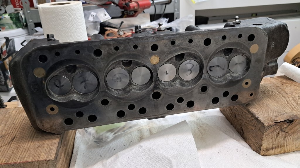 Speaking of valves, all 8 have been replaced. The main problem here was the valve seats. They are heavily pitted, particularly around number 2 and 3 exhaust ports. The seats should ideally be replaced but the plan is to get the engine running first and see what else is wrong then plan a full rebuild later on, so I’m going to defer replacing the valves seats until then. For now I just did my best to get some compression by over-grinding the exhaust port valves – far from ideal, and it was hard work on the hands, but it should at least run.