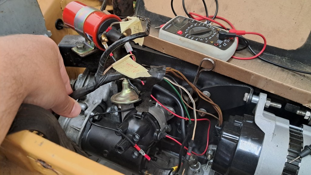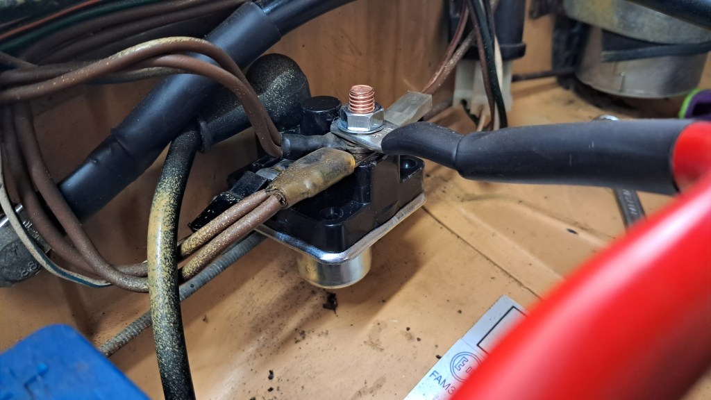 Finally I’ve begun putting the ignition electrics back together. A little guesswork needed as the wiring is, as usual, not exactly what’s documented in the Haynes manual – but never mind! Some block connectors have also been replaced, and a new starter solenoid has been installed; it now makes a very satisfying “CLACK!” when the ignition key is turned.