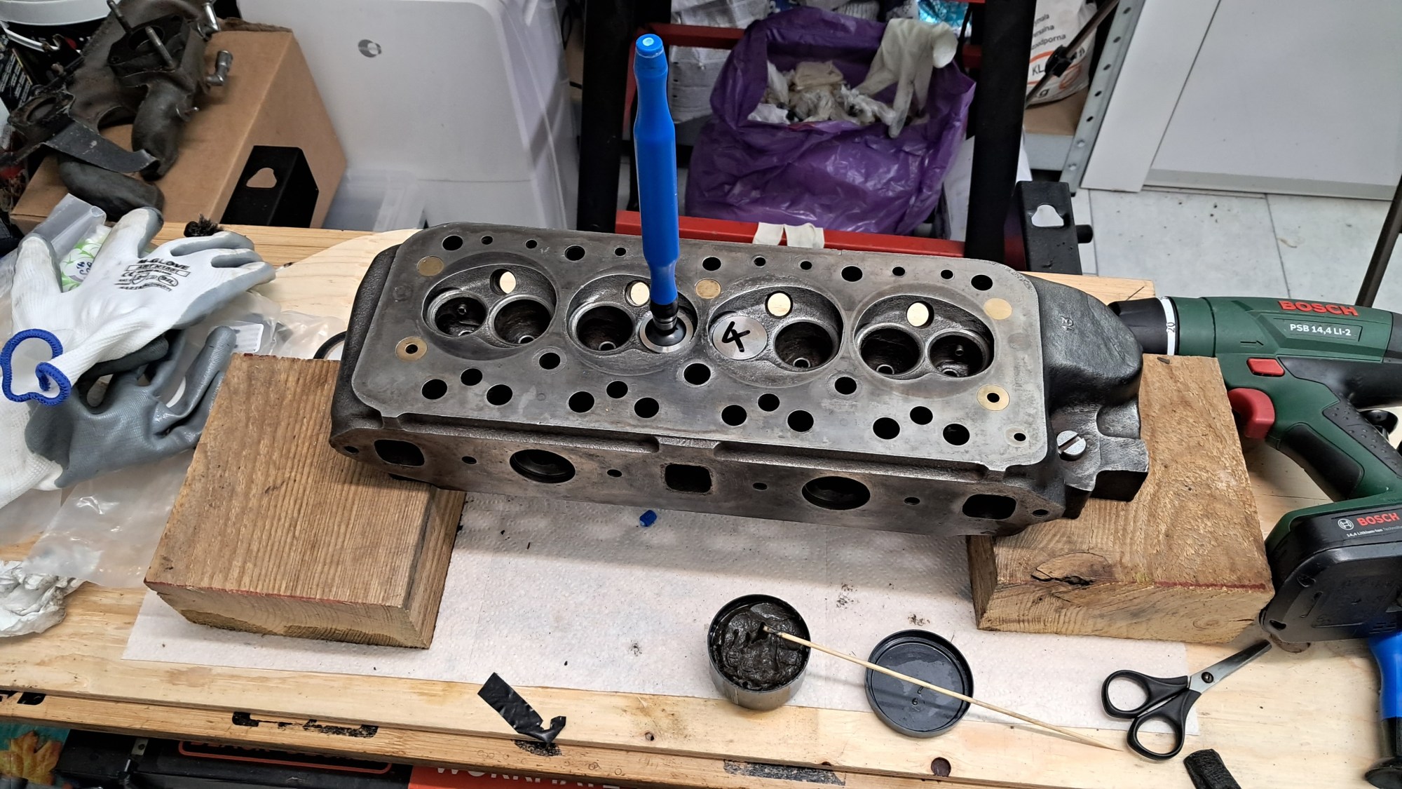 Speaking of valves, all 8 have been replaced. The main problem here was the valve seats. They are heavily pitted, particularly around number 2 and 3 exhaust ports. The seats should ideally be replaced but the plan is to get the engine running first and see what else is wrong then plan a full rebuild later on, so I’m going to defer replacing the valves seats until then. For now I just did my best to get some compression by over-grinding the exhaust port valves – far from ideal, and it was hard work on the hands, but it should at least run.