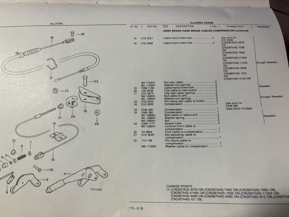 After playing the Autodoc lottery a few more times I finally found a 1:1 replacement for Agnetha’s brake shoes. As a Swedish export model she has a completely different rear brake setup to the factory standard, having more in common with Ford cars of the era. Having finally got the drum brakes working again, and as a result a working handbrake (yay – stopping power!), I put up a video and immediately got a comment about the Swedish brake setup that led to an explanation that the changes were indeed made in response to local legislation and, more importantly, some scans from the Allegro Parts Catalog listing all the Unipart numbers.